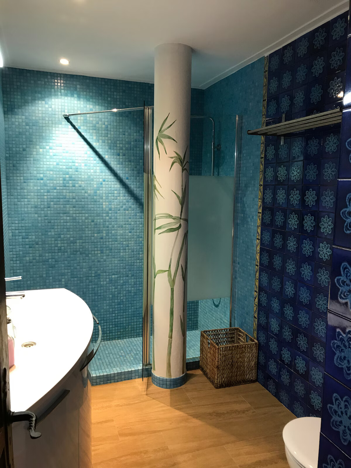 The spacious bathroom has just been renewed and has a big walk in shower ( 75cm wide x 1,75 cm long ). There is a hair dryer. Water with good pressure.